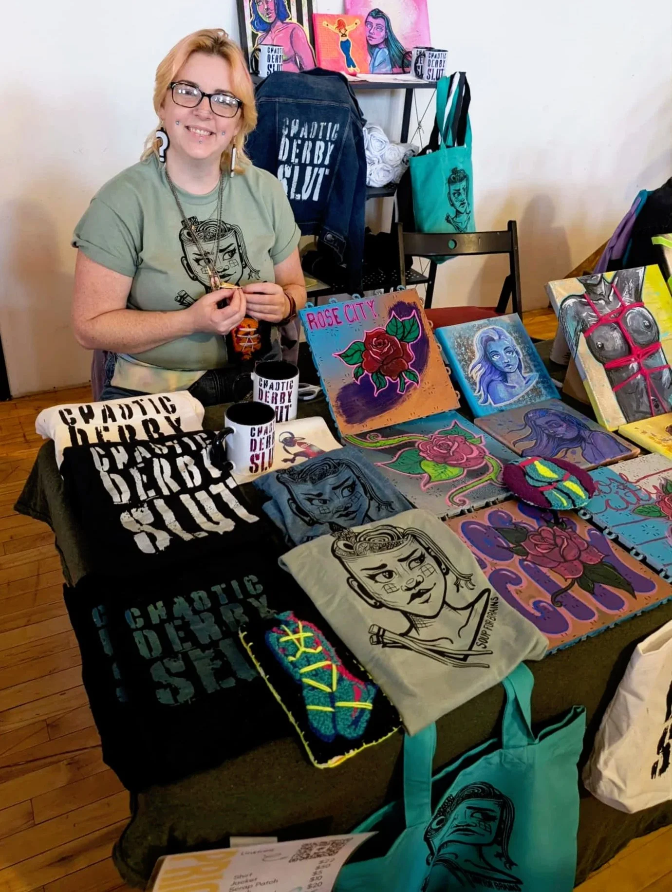 When they’re not making art, Mikaela can usually be found playing roller derby, running derby events, or relaxing at home with their menagerie of pets.